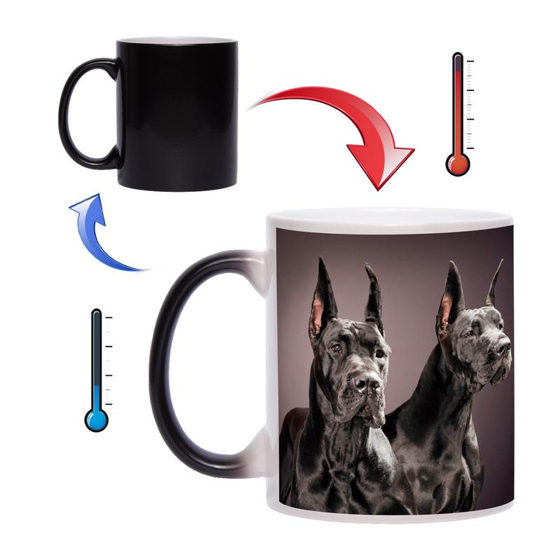 Чашка хамелеон - оригинальный подарок для Ваших друзей, коллег и близких людей. При наполнении кипятком, на чашке хамелеон проявляется изображение собак породы дог. Данная чашка будет стильным подарком к любому празднику. Сделайте обычное чаепитие ярким и интересным с чашкой хамелеон!
