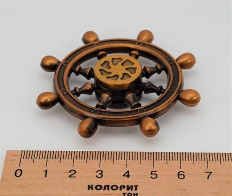 Спиннер металлический "Штурвал". Материал - металл, диаметр 7,00 см., высота 1,40 см., вес 62.37 грм., спиннер крутится тихо и бесшумно. Цвет - бронза.