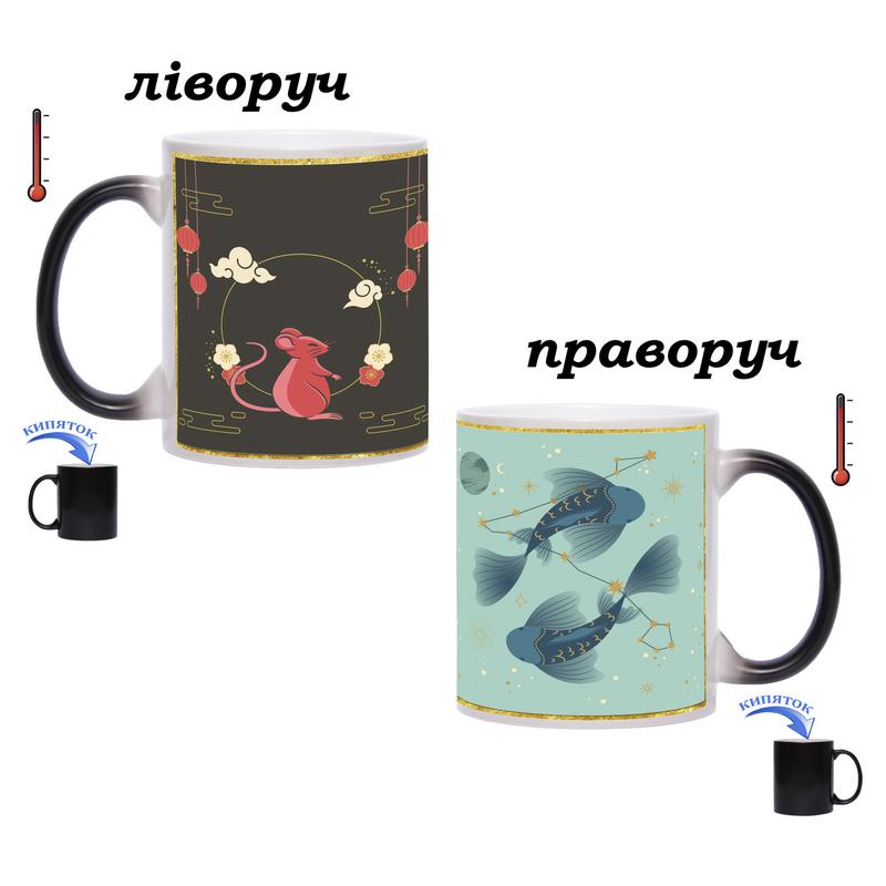 Чашка хамелеон - оригинальный подарок для Ваших друзей, коллег и близких людей. При наполнении кипятком, на чашке хамелеон с одной стороны проявляется удивительное изображение восточного знака Крыса, а с другой стороны - знака зодиака Рыбы. Это креативная чашка со знаками 2 в 1 - знаком по восточному (китайскому) гороскопу года и астрологическому знаку. Вам остаётся только подобрать нужное сочетание года и знака зодиака! Данная чашка будет стильным подарком к любому празднику. Сделайте обычное чаепитие ярким и интересным с чашкой хамелеон!