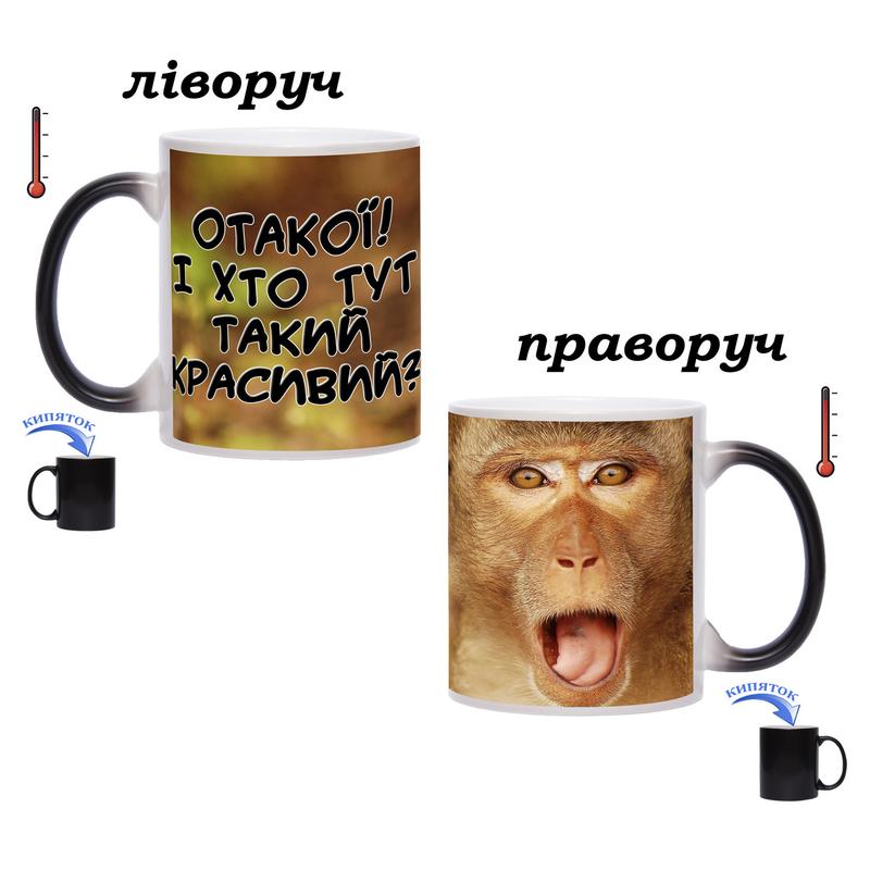 Чашка хамелеон - оригинальный подарок для Ваших друзей, коллег и близких людей. При наполнении кипятком, на чашке хамелеон проявляется красочная надпись "Хто тут такий красивий" и изображение обезьянки. Данная чашка будет стильным подарком к любому празднику. Сделайте обычное чаепитие ярким и интересным с чашкой хамелеон!