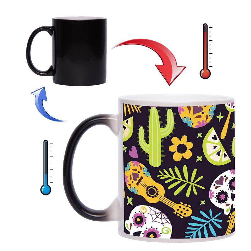Чашка хамелеон - оригинальный подарок для Ваших друзей, коллег и близких людей. При наполнении кипятком, на чашке хамелеон проявляется красочное изображение черепов в мексиканском стиле. Данная чашка будет стильным подарком к любому празднику. Сделайте обычное чаепитие ярким и интересным с чашкой хамелеон!