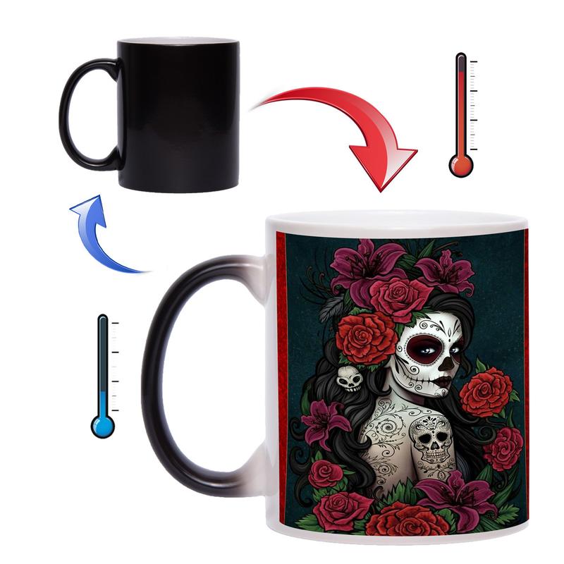 Чашка хамелеон - оригинальный подарок для Ваших друзей, коллег и близких людей. При наполнении кипятком, на чашке хамелеон проявляется красочное изображение девушки в образе смерти. Данная чашка будет стильным подарком к любому празднику. Сделайте обычное чаепитие ярким и интересным с чашкой хамелеон!