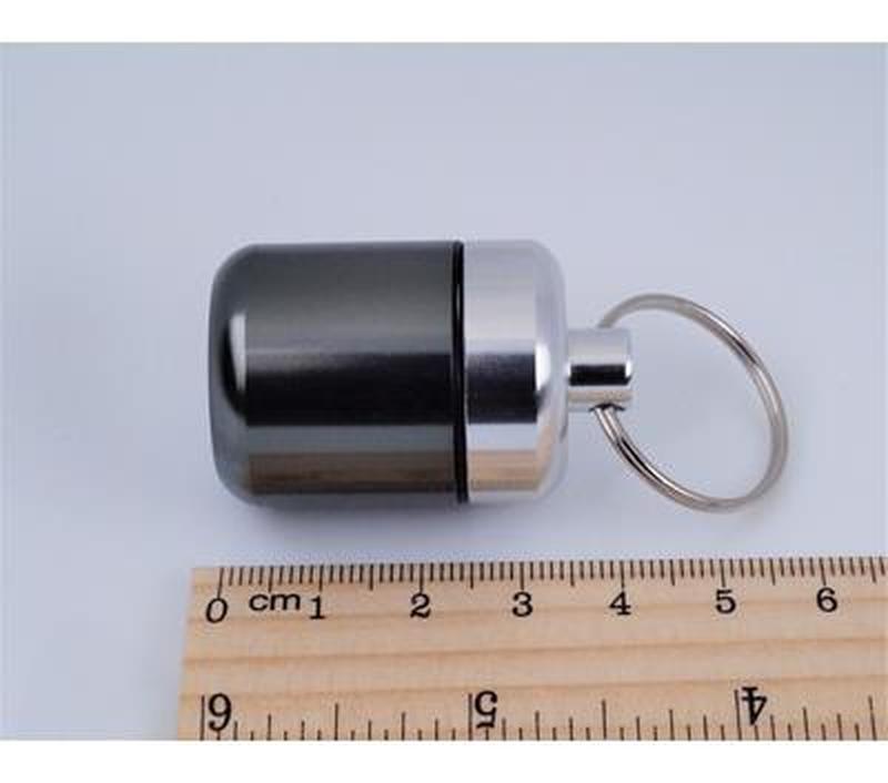 Брелок-капсула для хранения (цвет - графит/серебро). Длина самой капсулы 4,20 см., ширина 2,50 см., вес 22.00 грм. Капсула герметична, материал изготовления - алюминий.
