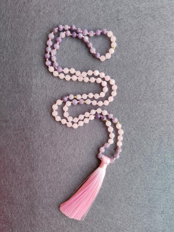 Эксклюзивные четки 108 ручной работы. Нанизанные на нитку, каждый камень проплетен через узелок - розовый кварц - камень любви и нежности. Он обладает невероятно сильной женственной энергетикой, очищает энергию, карму, удаляет блоки, не дающие вашей женственности и привлекательности играть на полную силу. -Лепидолит - считается талисманом творческих личностей (художников, актеров, поэтов, музыкантов и др.). Он помогает им полностью раскрыть свой талант и привлекает успех и любовь публики. Минерал дает силы справиться с трудностями в профессии и сохранить твердость мысли. Во всем мире длинные ожерелье-четки на 108 камней называются "мали" - mala. В наши дни они стали самым популярным инструментом в мире йоги. Причина не только в том, что они красивые, но и потому, что они действительно работают! Если вы не знаете, что такое четки малая, мы иногда рассматриваем их как розарий, но для йожев. Обычно они состоят из 108 бусин плюс одна гуру-бусинка в конце. Розовый кварц связан с сердечной чакрой - анахата. Это центр сострадания, любви и сострадания.