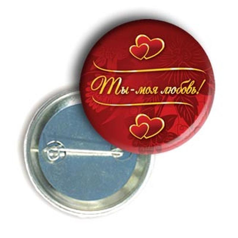 Значок-валентинка "ТЫ - МОЯ ЛЮБОВЬ!" с сердечками. Размер значка - 43 мм в диаметре.