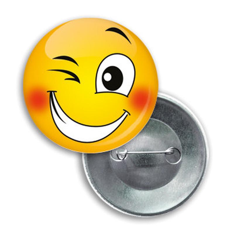 Закатной значок - смайлик - "Задорный". Диаметр значка - 56 мм.