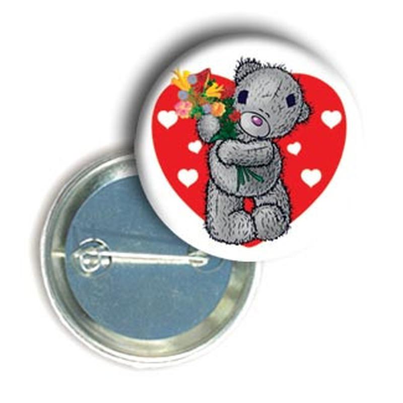Значок-валентинка "МИШКА С ЦВЕТАМИ НА ФОНЕ СЕРДЦА". Размер значка - 43 мм в диаметре.