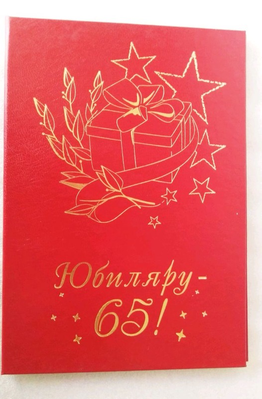 Тип подарунка: Інший тип Кілька примірників у наявності Диплом Ювіляру 65 років. Розмір у розгорнутому вигляді 30х21см. Доставка Новою поштою по передоплаті на карту Банка.