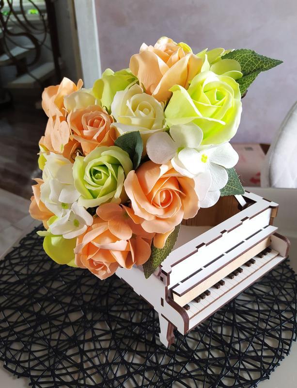 Виробник: Власне виробництво Тип подарунка: Букети Кілька примірників у наявності "Квітковий рояль" з секретним відділенням для власого подарунку Букет складений з мильних квітів, виготовлених на основі мильної суспензії Кількість відтінків квітів з мила в букеті — квітковий мікс Плодоніжка мильних квіточок — зелений пластик з отвором під бамбукову шпажку Розмір бутончиків — 5х5, 6х6 та 8х8 см Габарити рояля – 23,0х15,0х12.5 см ВІДТІНКИ КВІТОЧОК МОЖНА МІНЯТИ Наші мильні квіти не в’януть А неповторний і ніжний аромат зберігається від одного до трьох років Квіти, виготовлені на основі мильної суспензії – це сучасний тренд у флористиці Адже нев’янучі букети – це доречний подарунок коханим, колегам чи родичам напередодні знаменних подій