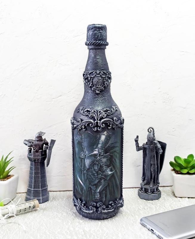 Бутылка ′Рыцарь′ Работа выполнена в готическом стиле Красивая фактура бутылкм в черном цвете с отливом серебристого металлика. Объемная лепнина на бутылке и крышке. Объем 0,7 л Материал:стекло,акриловые краски,акриловый лак,структурная паста,лепнина. Многослойное окрашивание. Бутылка покрыта лаком для легкого ухода за ней. Украсит интерьер и будет прекрасным подарком Отправка по всей Украине. Хорошего дня:)