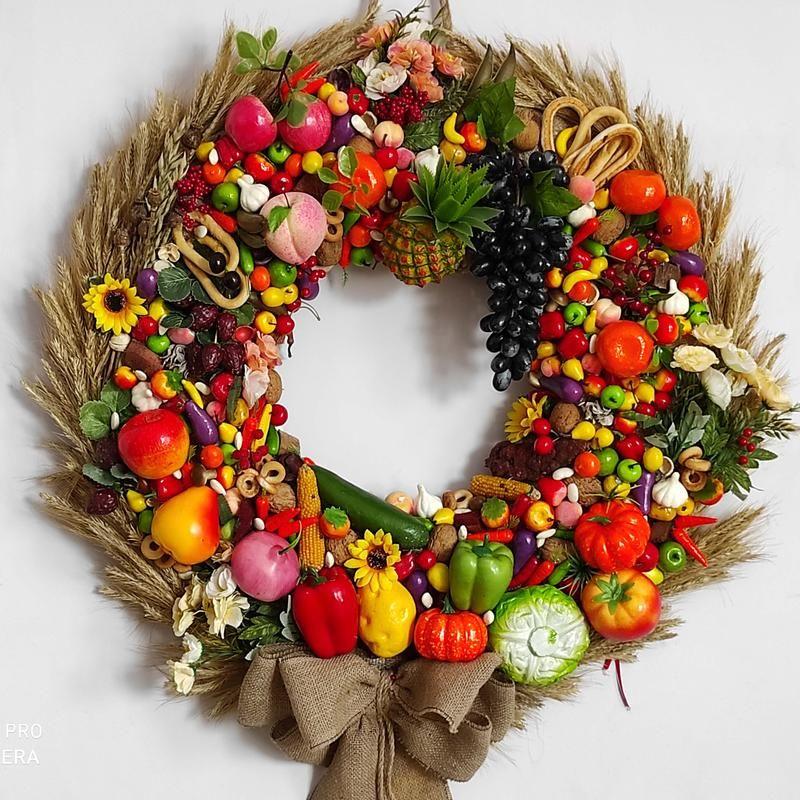 Роскошный фруктово-овощной венок - Символ плодородия и достатка. Венок для декора свадеб в стиле кантри, для декора кафе и ресторанов, для декора интерьера в стиле рустик. Венок сделан из более чем 250 искусственных фруктов и овощей, искусственных цветов, засушенных овощей, орехов, колосков пшеницы и банта из мешковины. Возможен вариант венка без банта или бант из украинского рушника. Диаметр венка 85см Могу сделать подобный венок меньшего формата. Роскошный оригинальный подарок на новоселье, день рождения, свадьбу.