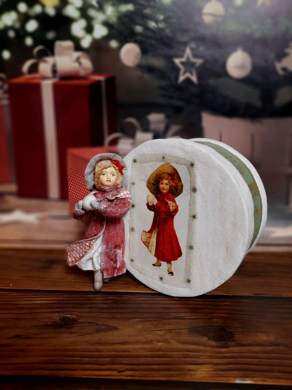 Тип подарунка: Оригінальний Кілька примірників у наявності Ватна іграшка за мотивами старовинної різдвяної розкриття. Під замовлення. Термін виготовлення 12 днів. Зріст — 11 см. Іграшка упакована в коробку з букового шпону, яка оформлена в техніці декупаж. На кришку коробки нанесене зображення різдвяної листівки.