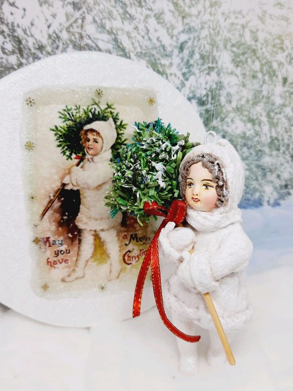 Тип подарунка: Оригінальний Кілька примірників у наявності Ватна іграшка за мотивами старовинної різдвяної листівки. На замовлення. Термін виконання замовлення 14 днів. Зріст 9 см. Іграшка упакована в коробку з букового шпону, яка оформлена в техніці декуппаж із нанесенням на кришку коробки зображення листівки.