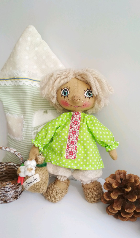 Тип подарунка: Сувеніри Текстильна лялька домовичок зроблений з натуральних гіпоалергенних матеріалів. Зростання-18 см, може сидіти, ззаду є петелька для підвішування. Розфарбувати акриловими фарбами, тонований кави. Постоли пов'язані з джутової мотузки, в руках мішечок з добром. Подаруйте собі чи близьким радість та затишок.