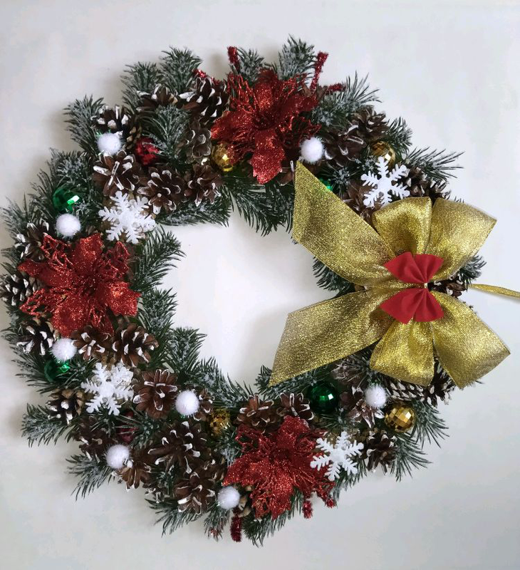 Тип подарунка: Оригінальний Шикарний Новорічний (Різдвяний) вінок на двері у біло-червоному кольорі. Вінок виготовлений з натуральних шишок з доповненням різного декору. Ручна робота. Діаметр 46см. Вінок має петлю ззаду, на яку його можна повісити. Приймаємо корпоративні замовлення. Відмінна прикраса інтер'єру магазину, будинку або офісу. Незвичайний подарунок для друзів і близьких.