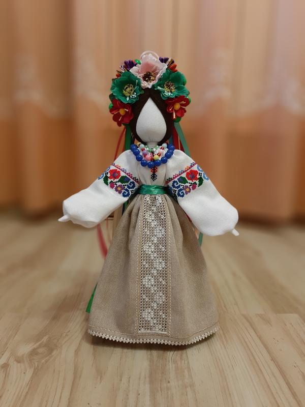 Тип подарунка: Народні сувеніри Авторська лялька-мотанка. Виготовлена з натуральних матеріалів. Стане окрасою та берегинею вашого дому. Може бути чудовим подарунком вашим близьким та друзям, або гарним сувеніром з України. Ручна вишивка, ручки армовані. Висота 32см разом з віночком.