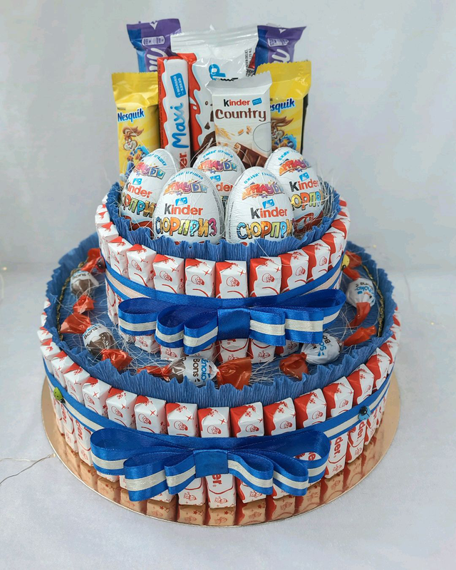 Тип подарунка: Оригінальний 🔥🔥🔥Взгляните какая же это нереальная вкуууууснотища !!!🍬 🍫🍭🤩 🎂Торт из киндер шоколадок - это шоколадная бомба💣💣💣 в Ваших руках, которая взорвется радостью, смехом и удовольствием.🥳 🎁 Удовольствием как дарить такие подарки, так и получать их!🤗🤗🤗 🎀Торт выполнен в виде шкатулки, которая открывается и заполняется любимыми сладостями .👍 ‼️Оформление в любой цветовой гамме, размере!‼️ 🎈🎉 Волшебный подарок любимому сыну или дочке , крестникам, брату,сестре, другу, подруге на любой праздник. Удивление и восхищение обеспечено!!! 🗓 Срок изготовления 1-2 дня. В составе: ✅Kinder Сюрприз ✅ Kinder Chocolate ✅ Kinder Maxi ✅ Kinder delice ✅Kinder Bueno ✅ Кinder counry ✅конфеты Кinder Schoko Bons ✅батончик Nuttella ✅батончик Lion ✅драже M&M's ✅ Milka Oreo ✅ KitKat ✅Конфет Twix, Snickers, Bounty, Milka, Nestle Несквик ‼️Самые любимые конфеты в количестве 140 шт.👍‼️ 🏷Диаметр 28 см. ‼️Внимание! При повторном изготовлении допускается незначительное изменение отдельных декоративных деталей с сохранением целостности дизайна и общей идеи .‼️