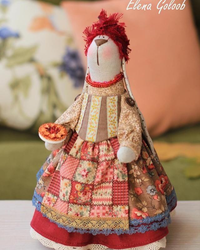 Український народ, завжди відрізнявся своєю гостинністю. Наша нація настільки добра та щира, що завжди з великим задоволенням люди йдуть в гості до українців.Будь – який гість, чи то запрошений, чи то випадковий приймається однаково шановано. Українки -хлібосольні і гостинні господині, які з задоволенням будуть пригощати смачними національними стравами своїх гостей І якщо ви хочете поздоровити зі святом чи віддячити за допомогу і підтримку своїх друзів з-за кордону чи тут, в Україні, або потрібен етнічний подарунок з душею України, вам стане у нагоді гостинна пані в яскравому вбранні, стилізованому під український старовинний одяг Розмір-25см Матеріали-льон,, бавовна, мереживо, стрічки Пиріг -полімерна мініатюра ручної роботи Товар под заказ