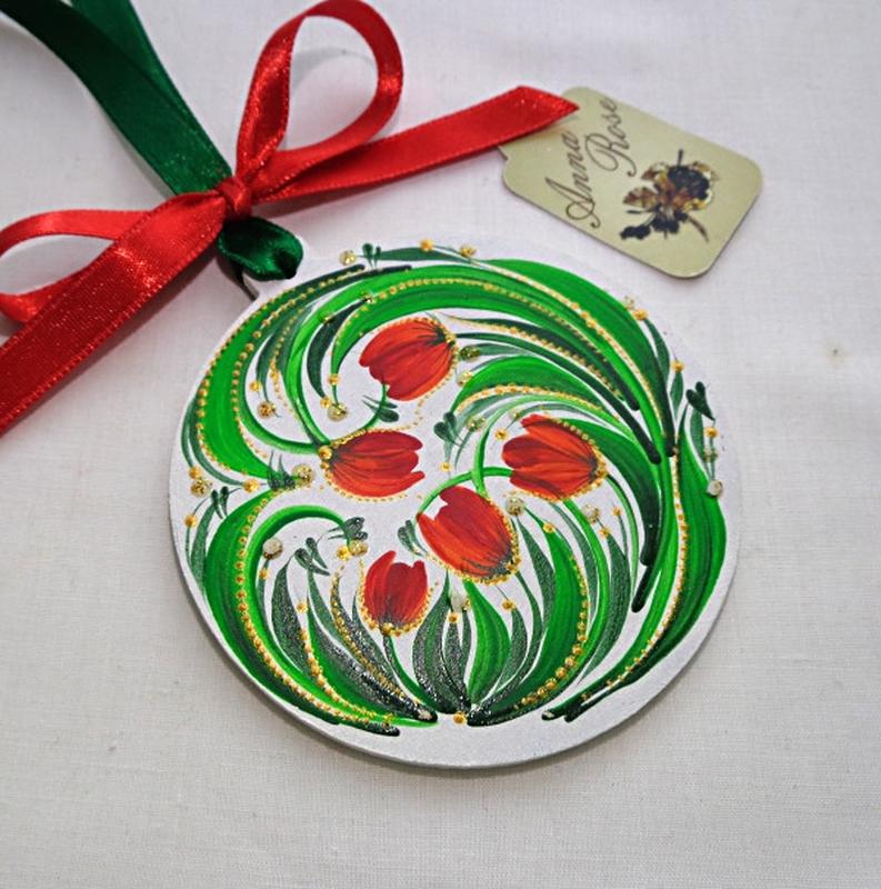 Новогодний белый шар ручной работы с украинской росписью "красные тюльпаны"