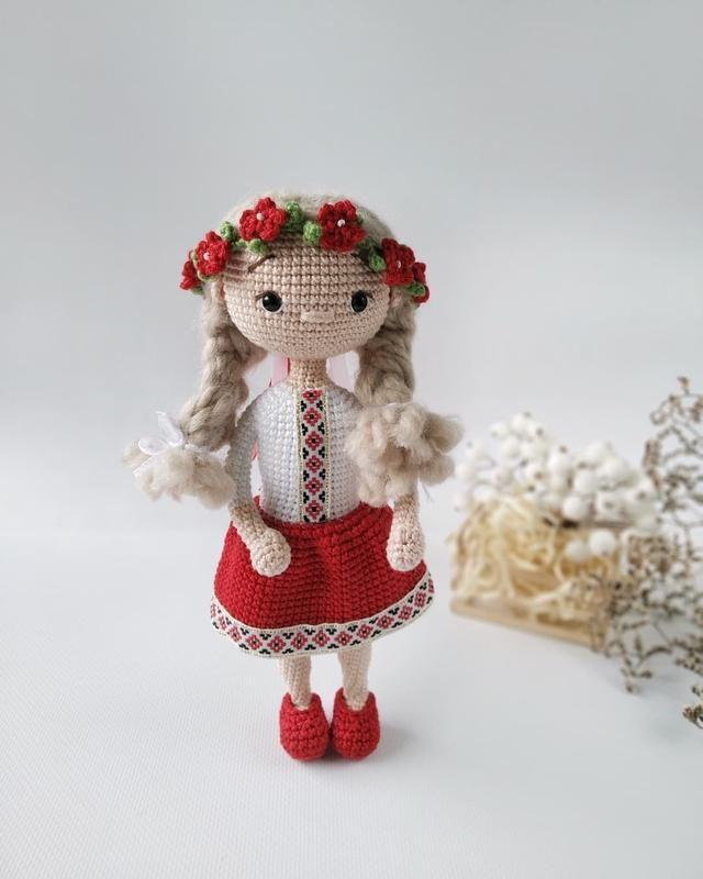 Куколка связана крючком, на каркасе. Одежда не съёмная. Венок снимается. Рост 20 см.