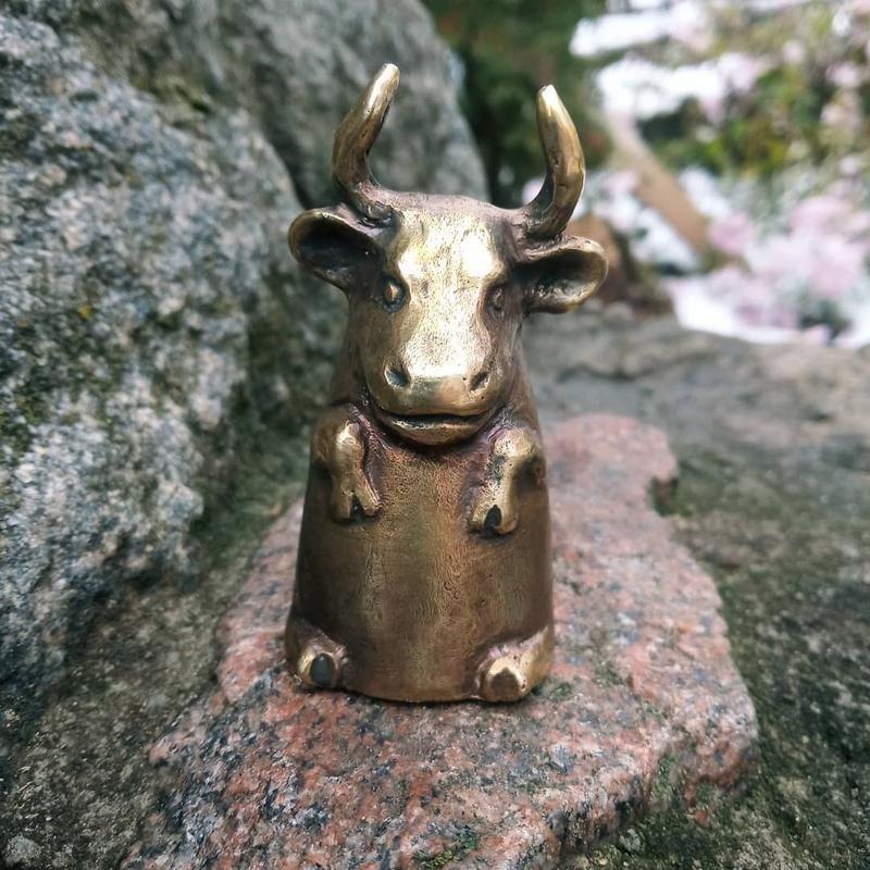 Авторский колокольчик ручной работы "Бычок" Изготовлен методом литья в земляные формы с последующей патинировкой и полировкой Вариант из алюминия серебристого цвета довольно лёгкий и его можно использовать как ёлочную игрушку Материал: латунь или алюминий