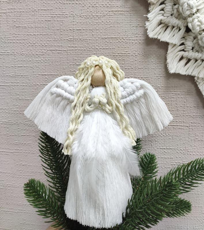 Верхівка на ялинку янгол біла в техніці макраме 22 см