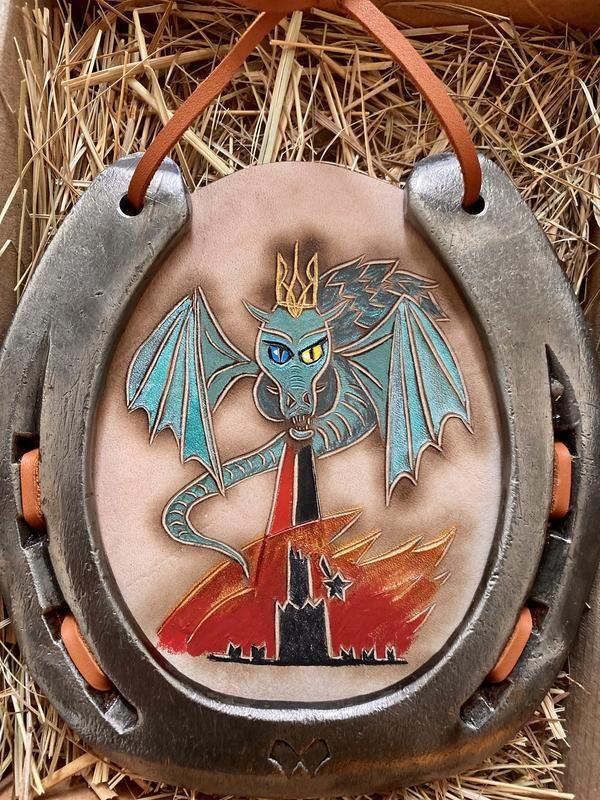 Справжня ношена конем підкова. Картина на шкірі. Авторська техніка різьблення, прожиг вогнем, гравіювання, акрилові фарби. Пакую в крафтову коробку на сіно. Додається сертифікат аутентичності, фото коня. Справжній кувальний цвях, щоб гарно повісити. Зі зворотного боку можу написати акрилом текст на замовлення. Товар под заказ