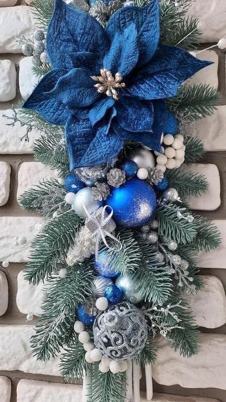 Композиция с бархатной синей пуансетией в сочетании с елочными украшениями станет интересным украшением Вашего стола, придаст праздничное настроение Вашему застолью. Композиция универсальная. Её можно не только ставить на стол . Она может быть необычной подвеской на стену или дверь.Длина 70см. Оплата-100% на карту или наложенный платеж (предоплата 160грн.). Доставка за счет получателя: желательно Новой Почтой (другие варианты при обсуждении). Сделано с любовью и хорошим настроением.