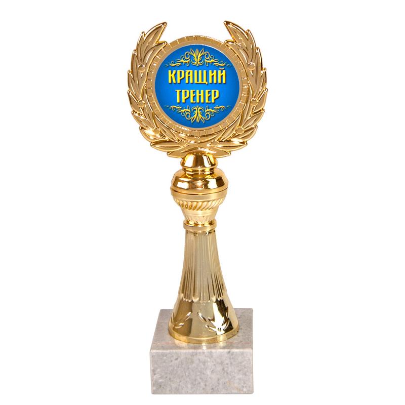 Статуэтка 570991 Кращий тренер Лавровый Венок - фигурка изготовлена из пластика благородного золотого цвета размером 19х8х4см на подставке из натурального камня 6х6х3см. На статуэтке располагается жетон диаметром 5 см с золотой надписью Кращий тренер на синем фоне. На бордовом пьедестале статуэтки может присутствовать имитация мраморных разводов. Отличная и оригинальная награда, которую можно подарить своему тренеру-наставнику, сотруднику или колеге на день рождения или просто в качестве презента вместе с каким-либо подарком. Подарок символичен и необычен, говорящий как дорог для Вас поздравляемый человек! Статуэтка упаковывается в индивидуальный подарочный тубус из прозрачного пластика. Уникальная упаковка разработана компанией Карнавал Приколов. Подарочную статуэтку Кращий тренер можно дополнить табличкой золотого цвета для пьедестала Кубков и Статуэток, с нанесением индивидуального текста поздравления или пожеланий (текст наносится черным цветом). А также в интернет-магазине Карнавал Приколов Вы можете купить оригинальные награды и призы в наличии и на заказ. Большой выбор кубков, медалей и наградных статуэток для любого повода.