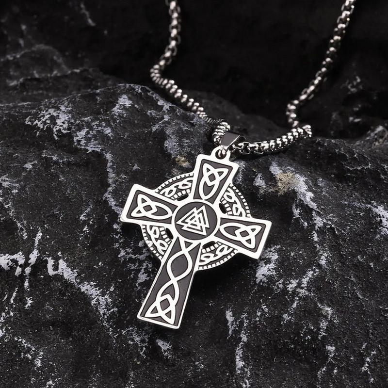 Амулет Кельтский Крест и Валькнут со стали Длина 45 мм Ширина 30 мм Цепочка в наличии КЕЛЬТСКИЙ КРЕСТ (IX-XI в.в.) соединение архаичного круга (мандалы) древних языческих обрядов с христианским крестом, т. е. символом высшей, привилегированной цивилизации. Кельты никогда не прекращали свои магические практики, но всегда верили, что крест, соединяя мир реальный и потусторонний, защитит и спасёт в трудной ситуации. Это амулет равновесия с природой. Содержит переплетения Трёх Стихий (Огонь, Вода и Воздух) и Бесконечности. Их равновесие в природе даёт покой, защиту и энергию жизни, а симметричное расположение в амулете -- самодостаточность и независимость от меняющихся обстоятельств. Валькнут - Символ Одина известен с древности, используется для защиты от тёмных сил. Символ высочайшего, сильнейшего скандинавского Бога наполнен сакральной мощью. Он дарует владельцу непоколебимое мужество. Валькнут - символ Одина и связанной с ним магии, символ переходов (мостов) между мирами. Каждый из треугольников Валькнута соответствует трем вертикальным мирам: один - Асгарду или Альфхейму (верхний мир, мир богов и героев), другой - Мидгарду (средний мир, мир людей), третий - Хелл или Свартальфхейму (нижний мир, мир мертвых).