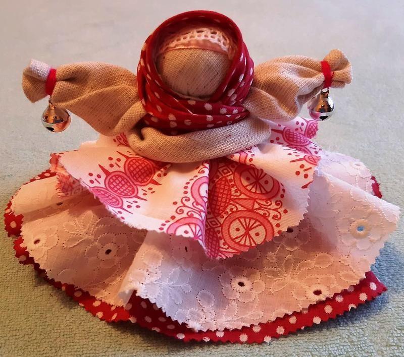 Кукла оберег Колокольчик охраняет дом и его обитателей от дурных вестей и зависти, от черной магии, проклятий, порчи и сглаза. Куколка олицетворяет собой Домаху – жену домового, которая бережет семейный очаг. Также она называется кукла-радость. Стоит только позвонить в бубенчики,которые куколка держит в руках, и дом наполняется радостью. Товар под заказ