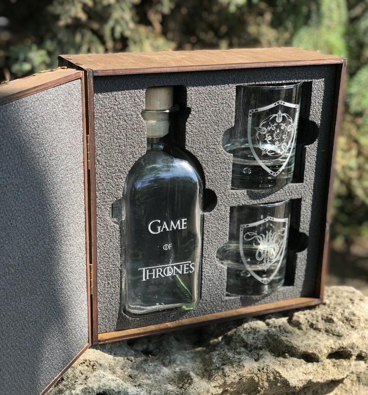 Подарочный набор «Game of Thrones». Набор для алкогольных напитков в подарочной коробке станет отличным подарком на Рождество и Новый год! Вы можете выбрать стакан с гербом любимого Великого Дома и начать свое сражение! Ценители сериала «Game of Thrones» и сборника Дж.Р.Р. Мартина «Песнь Льда и Пламени» точно будут довольны таким презентом. Коробка выполнена из натуральной березовой фанеры толщиной 4 мм. Фанера шлифуется, затем при помощи лазерной резки вырезается заготовка коробки, собирается и вскрывается краской с эффектом старения. Внутрь коробки вклеен материал, который прочно защищает стеклянную посуду. Коробка украшена античной фурнитурой цвета старой латуни. На крышке коробки, стаканах и бутылке сделана лазерная гравировка. Благодаря такому виду нанесения, рисунок не стирается и не блекнет, а значит стаканы даже можно мыть в посудомоечной машине. Все наборы для алкогольных напитков, которые мы делаем, сделаны с любовью и вниманием. Наши стильные стаканы, рюмки, бокалы и графины будут служить их владельцу в течение многих лет в будущем. Этот набор станет наиболее подходящим подарком для любого мероприятия. Мы уверены, что вашим друзьям понравится этот подарок! В набор входит: 1 бутылка, 2 стакана и коробка с металлической фурнитурой. Размеры: Декантер (бутылка): 8х8 см, высота – 22 см. Объем 700 мл. Стакан: диаметр – 8 см, высота – 10 см. Объем 310 мл. Коробка: 25 x 25 x 12 см. Товар под заказ