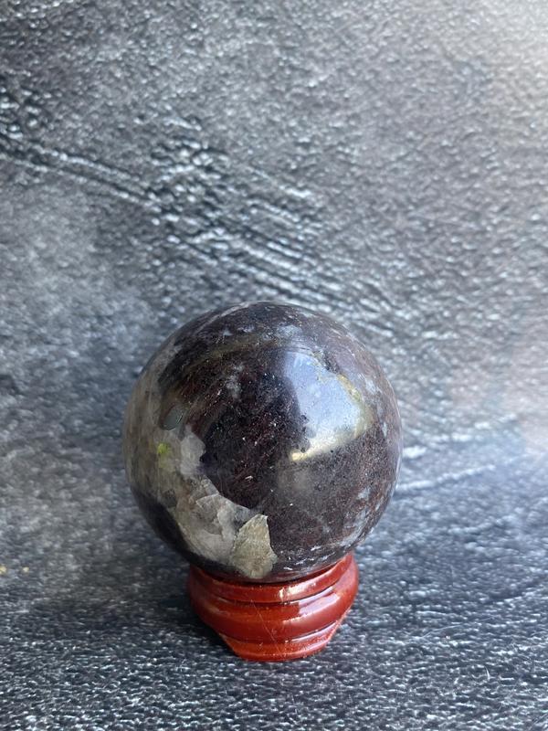 Пропонуємо Вам кулю( шар, сфера) з натурального гранату та кварцу. Діаметр: 45 мм; вага : 169 г.