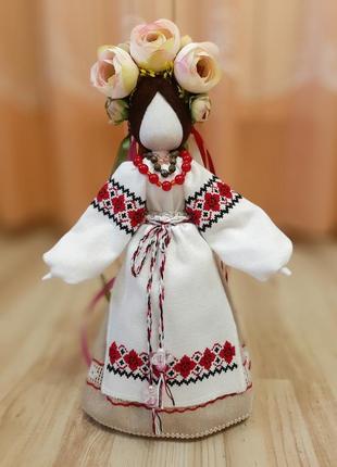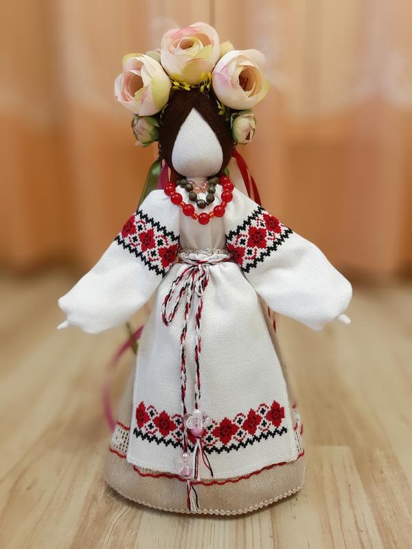 Кукла-мотанка в нежных пастельных тонах. Изготовлена из натуральных материалов. Стоит самостоятельно, ручки армированы. Высота 32см вместе с венчиком. Рубашка и фартук вышиты вручную крестиком, по подолу юбочки - сетка. Такая куколка будет украшением вашего дома и отличным подарком вашим близким и друзьям, красивым сувениром из Украины.