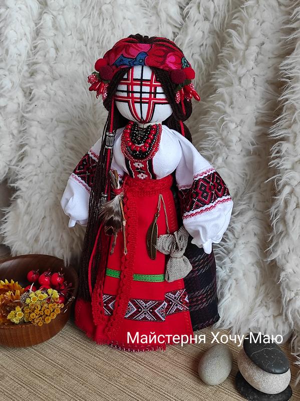 Мольфарами называют волшебников в Карпатах. Они осуществляют посредство между двумя мирами: реальным и потусторонним, а также поддерживают гармонию во Вселенной. Мольфарыцеют больных, умеют читать по звездам, повеселятся бурями, заклинивают змей, могут предугадать будущее и прошлое и бороться с таинствами. Наша мотанка сделана из натуральных тканей, льна, хлопка, шерсти. Имеет высоту 30 см, закреплена на подставке, руки гибкие. Срок изготовления 3-5 дней