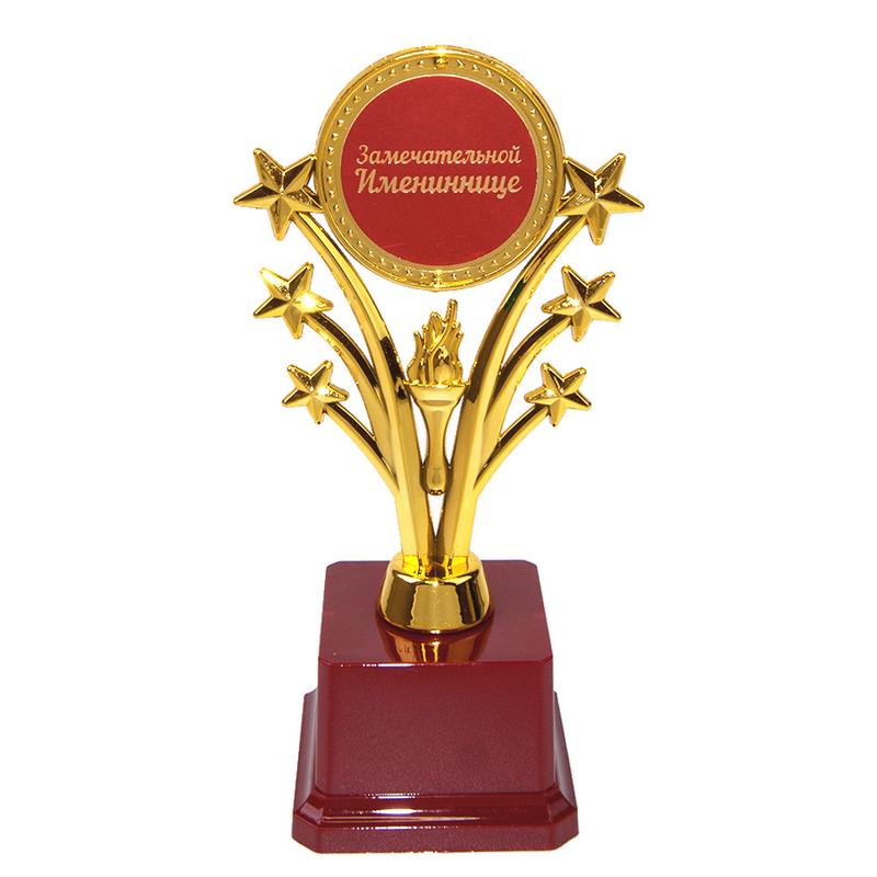 Статуэтка 57380 Замечательной имениннице Звездный салют – подарочная статуэтка на день рождение. Наградная статуэтка изготовлена из пластика, фигурка, в виде звездного салюта, высотой 14см, шириной 10см и длинною 1см покрыта благородным золотым цветом, на бордовом пьедестале 6х6х5см. Статуэтка упаковывается в индивидуальный подарочный тубус из прозрачного пластика. Уникальная упаковка разработана компанией Карнавал Приколов. На бордовом пьедестале статуэтки может присутствовать имитация мраморных разводов. Подарочную статуэтку с золотой тисненой надписью Замечательной имениннице на красном фоне, можно дополнить табличкой золотого цвета для пьедестала Кубков и Статуэток, с нанесением индивидуального текста поздравления или пожеланий. Интернет магазин товаров для праздников Карнавал Приколов предлагает кубки и статуэтки собственного производства оптом и по дропшиппингу. Вы можете оформить заказ на сайте и задать любые интересующие вопросы менеджеру, заказав звонок.
