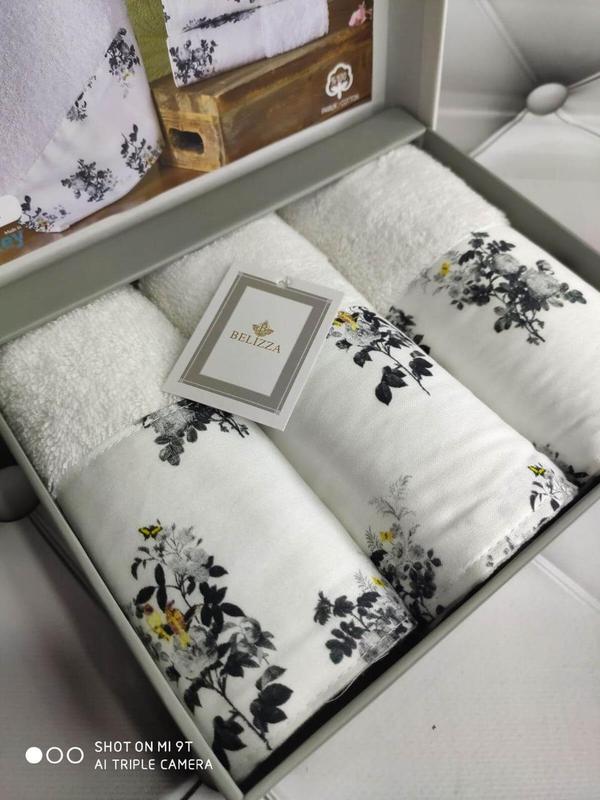 Дуже красиві та якісні набори рушників турецької компанії Belizza. У комплекті три рушники 30*50 см. Рушники бавовняні, висока щільність – 500 г/м2. Унікальність цих рушників – вставка чудового малюнка із тканин сатин digital. Подарункова картонна упаковка.