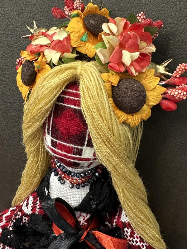 Авторская Мотанка Высота 30 см Ручная вышивка на рукавах На деревянной подставке Изготовлена с любовью