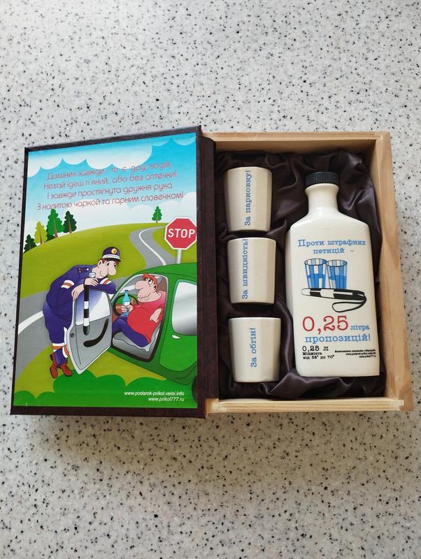 Сувенир, прикол, подарочный набор: Книга-шкатулка "100 аргументов против штрафов ГАИ". Оригинальная шкатулка из натурального дерева выполнена в виде книги с тематическим названием и вмещает в себя веселый набор - 3 рюмки и бутылочку вместимостью 250 мл. На рюмках и бутылки выполнены прикольные надписи. Любителям всевозможных сейфов и тайников Книга-шкатулка пригодится особенно, ведь снаружи она выглядит как вполне обыкновенная солидная книга, бережно хранившаяся в семейной библиотеке. Места в книге-шкатулке вполне достаточно для того, хранить в ней «заначку», различные ценные бумаги, ключи и другие необходимые вещи. Размер книги 225х170х63 мм.