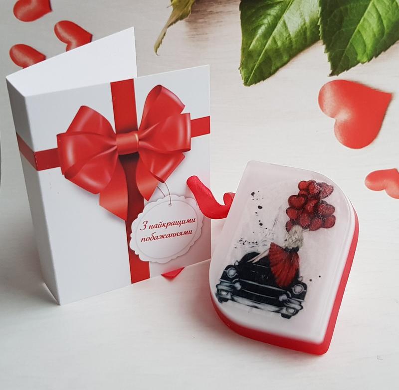 Подарки любимым мыло "Девушка с шариками" Мыло с ароматом сочных фруктов маракуйи, тосканского винограда, желтых пионов, ванильных орхидей и тонких ноток свежей зелени. Картинка в мыле водорастворимая *Упаковка: - книжка-открытка из плотной бумаги: 60*175 мм - атласная лента вес 80 гр *отправка Укр почтой, Rozetka, Meest Express: понедельник, пятница