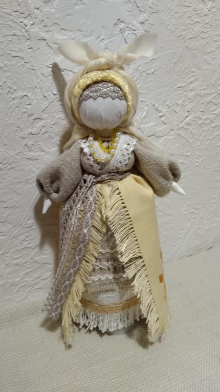 Мотанка выполнена из натуральной ткани, на деревянной подставке. Рост- 23 см.удаван в каждой семье кукла-мотанка должна была выполнять роль защиты, была символом мудрости, поляней рода, символом матери-производители и связи между поколениями, одна из самых длинных игрушек и сакральных (сАшняльных) существ нашего народа, которой тысячи и тысячи лет. Сегодня мотанка это лучший подарок, выполненный в украинских традициях.
