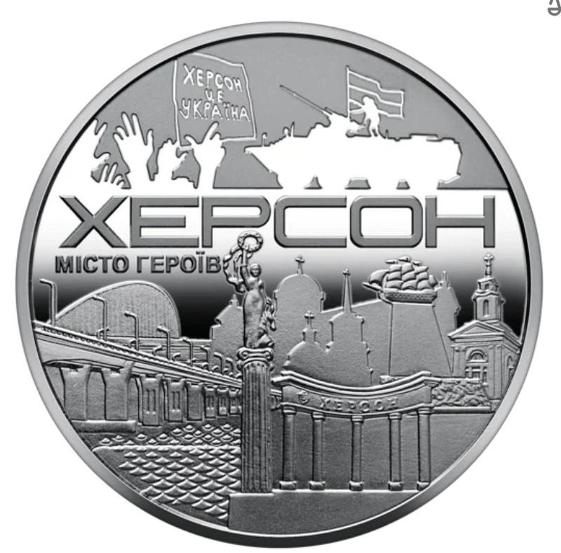 Пам`ятна медаль присвячена нескореному Херсону, героїчній Херсонщині, яку омивають два моря і територією якої пролягають сухопутні шляхи до окупованого Криму. Херсонщина – земля, що має давню історію, край козацької слави, колиска суднобудування. І саме Херсонщина була окупована ворогом з перших днів повномасштабного вторгнення, а Херсон – єдиний обласний центр, який із 24 лютого 2022 року вдалося захопити російським загарбникам. Херсонщина стала одним з осередків партизанського руху опору, жителі міста та регіону, попри небезпеку та агресію, рішуче виходили на мітинги, організували рух громадського спротиву. 256 днів місто було під окупацією, але сьогодні Збройні Сили України повернули Херсон під український прапор! На реверсі медалі на дзеркальному тлі напис – ХЕРСОН/МІСТО ГЕРОЇВ, що ділить поле медалі надвоє: у верхній частині дзеркальна композиція, що символізує громадський спротив російському окупанту та радісну зустріч українських воїнів після звільнення, у нижній – стилізована панорама міста з його історичними будівлями, Антонівським мостом, скульптурою з меморіалу парку Слави, пам’ятником першим корабелам тощо. На аверсі медалі розміщено: угорі написи – 2022/УКРАЇНА, унизу – малий Державний Герб України, у центрі композицію: на тлі стилізованої карти міста рядки з історичного роману Ліни Костенко “Берестечко”: НЕ ДОПУСКАЙ ТАКОЇ МИСЛІ,/ЩО БОГ ПОКАЖЕ НАМ НЕЛАСКУ./ЖИТТЯ ЛЮДСЬКОГО СТРОКИ СТИСЛІ./НЕМАЄ ЧАСУ НА ПОРАЗКУ./ЛІНА КОСТЕНКО; ліворуч – портові крани, праворуч – Станіслав- Аджигольський задній маяк – пам’ятку історичної та культурної спадщини, зображення дельфінів і чайок; логотип Банкнотно-монетного двору Національного банку України (ліворуч над кранами). Рік карбування 2022 рік Діаметр 35,0 мм Тираж 65000 Дата введення в обіг 17.11.2022 Метал (позначення) СuNi15Zn21 Гурт гладкий Метал (назва) нейзильбер Художник Фандікова Наталія Категорія якості карбування спеціальний анциркулейтед Скульптор(и) Демяненко Анатолій , Дем`яненко Володимир; програмне моделювання - Лук`янов Юрій