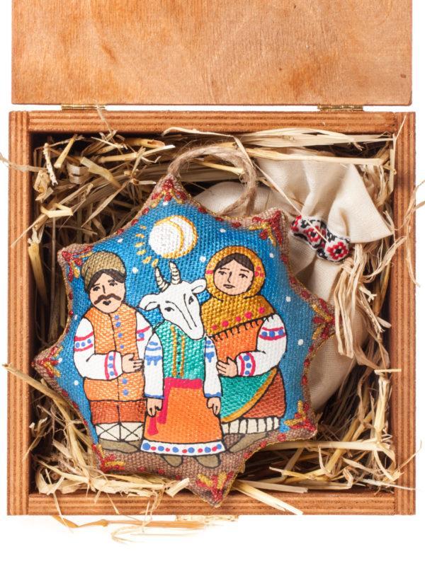 Подарунковий набір №6c • Дерев’яна коробка, зірка різдвяна, чай трав’яний, солома. Зірка різдвяна з нової новорічної колекції “Від Романа до Йордана”— іграшка пошита з натуральних тканин, наповнена синтепоном, розписана вручну тернопільськими майстрами. Чай трав’яний — Ми готували свій трав'яний збір влітку в Сколівських Бескидах. У складі чаю від Кози-Дерези — іван-чай, материнка, чебрець, м'ята, листя чорниць, суниць та смородини. Гарно смакує з імбирним різдвяним печивом. Розмір іграшки — 11x11x3 см Дерев'яна коробка — 16,5х16,5х11 см Чай трав'яний — 50 гр