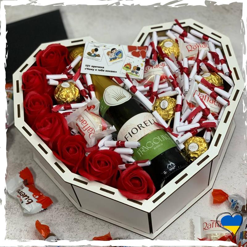 Нежный подарок для нее❤️ В состав входит: ▫️мыльные розы ▫️игристое вино "Fragolino" ▫️101 причина "Почему я тебя люблю" ▫️конфеты Fererro Rocher ▫️конфеты Raffaello