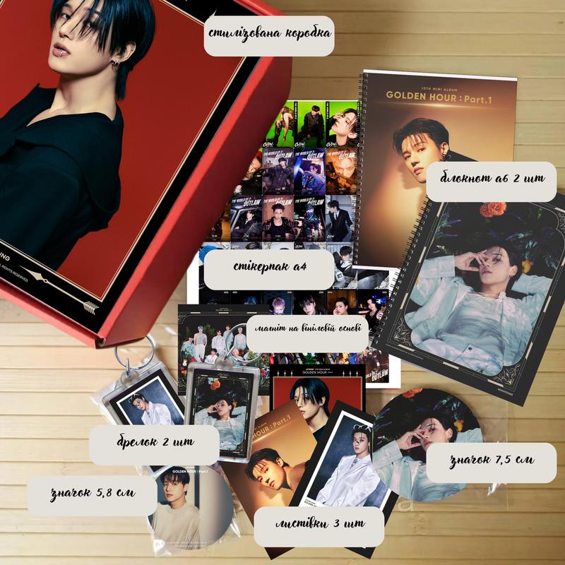 Большой комплект Чон Уён (정우영, Jung Woo Young) - 2 блокнота - 2 брелка - стикерпак а4 - значок 5,8 см - значок 7,5 см - магнит на виниловой основе - набор открыток 10*15 см 3 шт - коробка