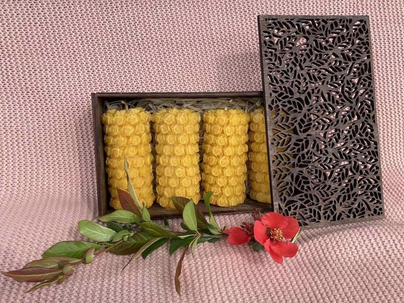 Эта красивая деревянная коробка содержит 4 свечи из пчелиного воска. Наши свечи изготовлены из 100% натурального пчелиного воска. Каждая свеча изготовлена вручную, что обеспечивает качество и мастерство, создавая единственный в своем роде уникальный подарок от природы! Свечи из 100% пчелиного воска выделяют отрицательные ионы, извлекающие токсины из воздуха. Они гипоаллергенны и обладают приятным медовым ароматом. Используется хлопковый фитиль. Вы найдете большое удовольствие от этой свечи. Размеры: высота 9,5 см, диаметр 4 см. Время горения: 6-8 часов. Наслаждайтесь!