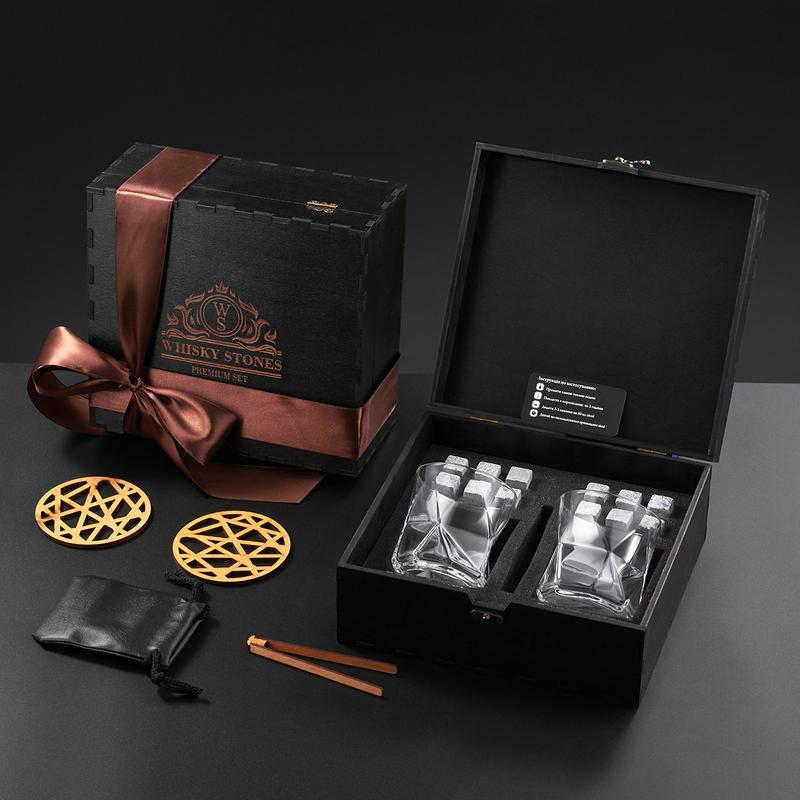 В подарочный набор входит: 1. Качественная деревянная подарочная упаковка 25 на 24 см на 11 см в темном дереве. Внутренняя часть - это мягкий ложемент (камни и бокалы всегда будут целые и красиво, престижно хранится) в котором лежат оригинальные камни для виски 12 шт, мешочек для камней из экокожи, 2 бокала на выбор, щипцы и 2 подставки под бокалы. 2. Оригинальные американские Камни для охлаждения виски 12 шт (на фото в открытом виде камни). Камни предназначены для охлаждения виски, охлаждают и не разбавляют его как лед. У нас есть сертификат качества. Камни оригинал из США. 3. Мешочек из экокожи. Наши мешочки для виски изготовлены из качественной экокожи, которая имитирует натуральную кожу, но не трескается от минусовой температуры. Также ни в коем случае не рекомендуем покупать наборы с мешочками из натуральной ткани - она натягивает посторонние запахи и вкусы из холодильника, также ворсинки затем попадают в виски. 4. Стильные бокалы для виски 2 шт Sterling, Bohemia Quadro или Bohemia Barline на выбор. Справа на сайте можете выбрать какой вариант. 5. Деревянные щипцы, которые в отличии от металлических не поцарапают и не повредят камень. 6. 2 деревянных костера (подставки) по стаканы, чтоб не царапать стол и стаканы.