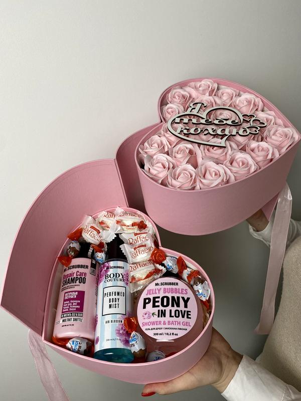 Подарункові бокси які не втрачають свою актуальність 🤩і кожна дівчина мріє про них 😉🎁 Бокс на 2 яруси в рожевому кольорі Наповнення: -21 шт мильні рози; -Гель для душу 300ml Mr.Scrubber; -Парфумований міст для тіла 200ml Mr.Scrubber; -Шампунь для інтенсивного відновлення волосся 200ml Mr.Scrubber; -Цукерки Раффаелло 6шт; -Цукерки Шоко Бонс 10шт; -Топер можна на вибір; -Коробка на 2 яруси; -Деревʼяний наповнювач. В наявності є різні коробки на два яруса, три яруса, чотири яруса та пʼять ярусів 🤩В різних кольорах ☺️ Встигни забронювати свій подарунок 🎁Адже потім може і не бути 🥲 В наявності також багато інших варіантів таких боксів, щоб побачити всі варіанти дивіться наш каталог товарів або пишіть та дзвоніть нам в зручний для вас меседжер.