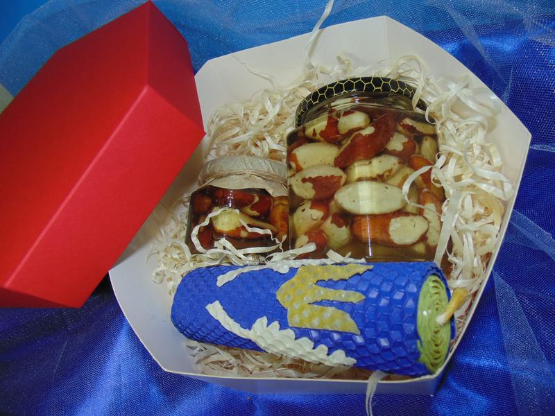 Предлагаем подарочные наборы с натуральными медовыми вкусностями для вас, ваших, друзей, знакомых и близких. Состав: 1 баночка 0.400 г: (Вес 0.700г-1шт) 1 баночка 0,100г (Вес 0.230г-1шт) 1. Бразильский орех с медом 0.700 2. Бразильский орех с медом 0.230г 3. Свеча 10/4 Общий вес набора составляет 1кг . Есть готовые наборы или можно собрать свой по вкусу и количеству шт Фундук Бланшированный, Бразильский орех, Кешью жареный, Греческий (грецкий) орех, Миндаль сырой, Арахис очищенный, Ассорти из орешков, Изюм и Курага в меде. Вкусный и полезный подарок с медом и орешками. Орешки с медом способствуют поднятию настроения, снимают усталость и являются отличным стимулятором умственной активности. Орешки содержат большое количество витаминов и питательных веществ. Такой подарок может храниться без холодильника долгое время! Условия хранения: темное место при комнатной температуре Срок хранения: до 12 месяцев
