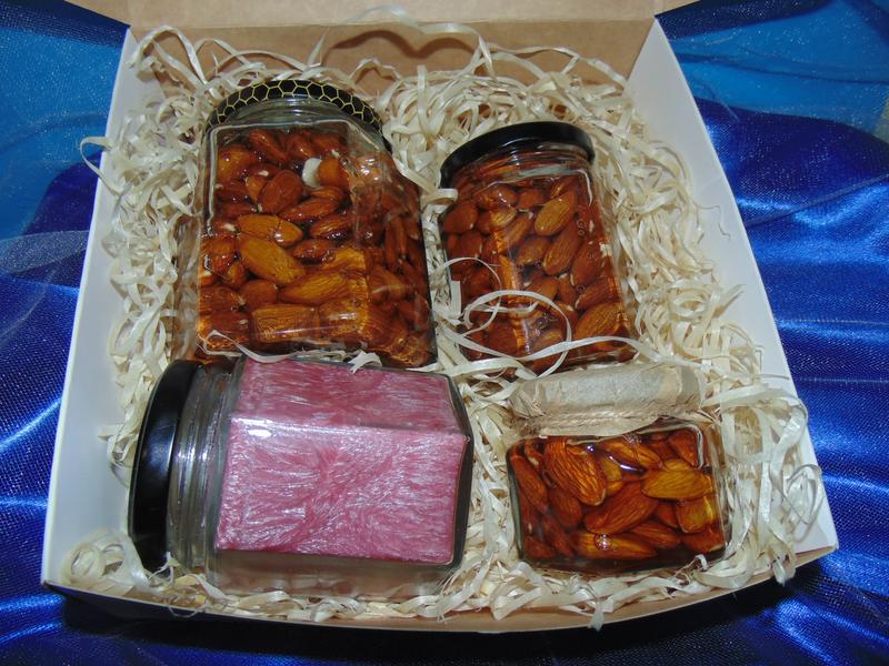Предлагаем подарочные наборы с натуральными медовыми вкусностями для вас, ваших, друзей, знакомых и близких. Состав: 1 баночка 0.400 г: (Вес 0.700г-1шт) 2 баночка 0,200г (Вес 0.350г-1шт) 3 баночка 0,100г (Вес 0.230г-1шт) 4 Свеча из ПАЛЬМОВОГО воска 200г 1. Миндаль с медом 0.700г 2. Миндаль с медом 0.350г 3. Миндаль с медом 0.230г 4 Свеча из ПАЛЬМОВОГО воска 200г Общий вес набора составляет 1.5кг . Есть готовые наборы или можно собрать свой по вкусу и количеству шт Вкусный и полезный подарок с медом и орешками. Орешки с медом способствуют поднятию настроения, снимают усталость и являются отличным стимулятором умственной активности. Орешки содержат большое количество витаминов и питательных веществ. Такой подарок может храниться без холодильника долгое время! Условия хранения: темное место при комнатной температуре Срок хранения: до 12 месяцев